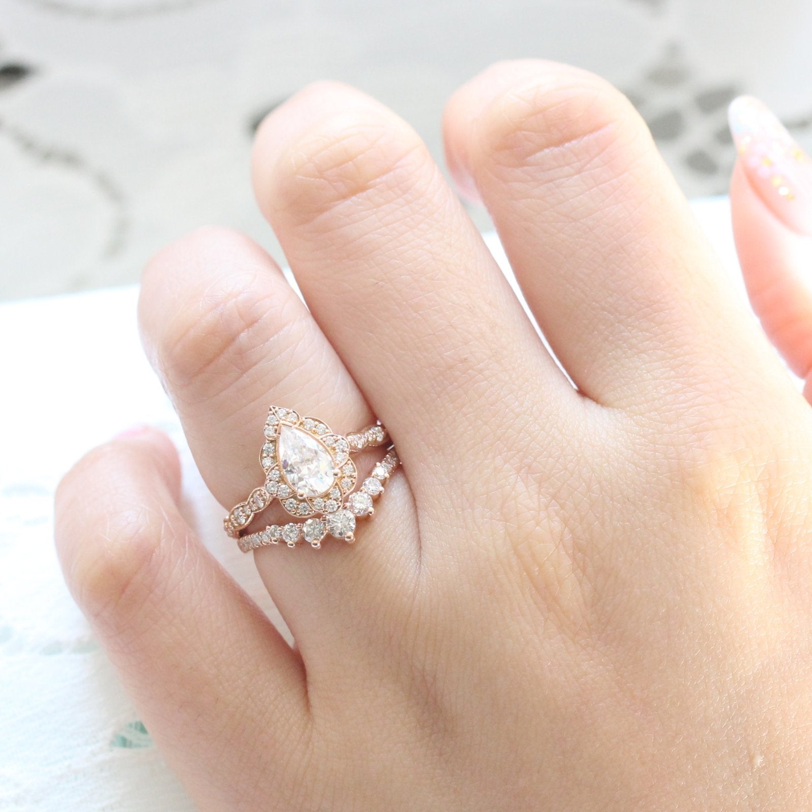 1.0CT Pear Cut Moissanite Halo Bridal Ring Set – Darby Diamonds LLC