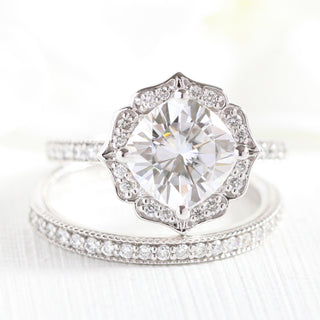 2.30CT Cushion Moissanite Vintage Halo Bridal Ring Set
